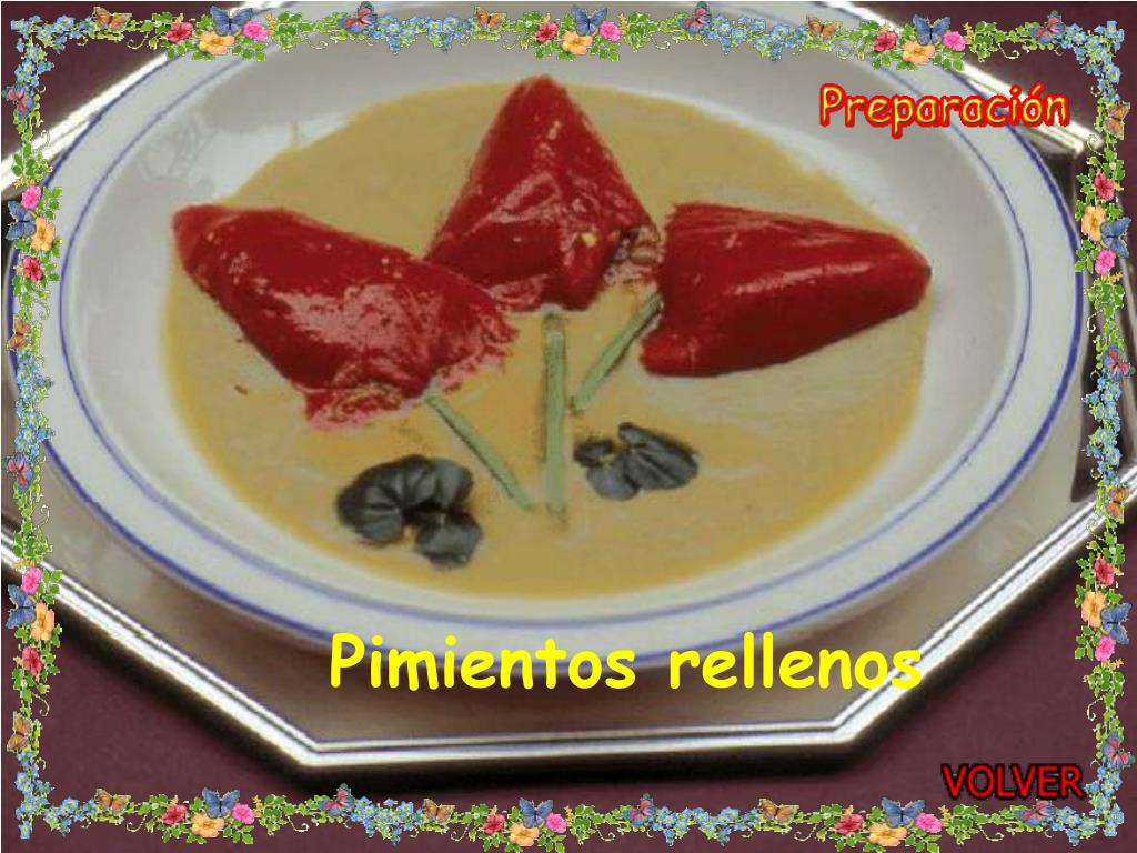 Preparación Ingredientes Elaboración:Limpiar y lavar el pimiento y untarlo con aceite. Sazonar por dentro y por fuera y ponerlos a asar en el horno, en besuguera o placa, unos 25 minutos. Sacar y cubrir con un paño para que, una vez fríos, se pelen con facilidad. Poner a cocer las manitas en la olla exprés durante 20 minutos, con agua, sal, cebolla, zanahoria, puerro y perejil. Hacer un sofrito en la sartén con el aceite, la cebolla, los ajos y los tomates pelados y picados. Añadir el jerez y dejar reducir unos minutos. Incorporar las manitas cortadas en trocitos. Rellenar con ello los pimientos y colocar en una fuente refractaria. Rociar con un poco de mantequilla derretida y meter al horno a gratinar durante unos minutos. 6 pimientos grandes, todos del mismo tamaño. 1 cebolla pequeña. 2 dientes de ajo. 2 tomates maduros. 1 vaso de vino de jerez. 150 ml. de aceite de oliva. 3 manitas de cerdo. Cebolla. Zanahoria. Puerro Perejil. Sal Pimienta. Un poco de mantequilla para gratinar.