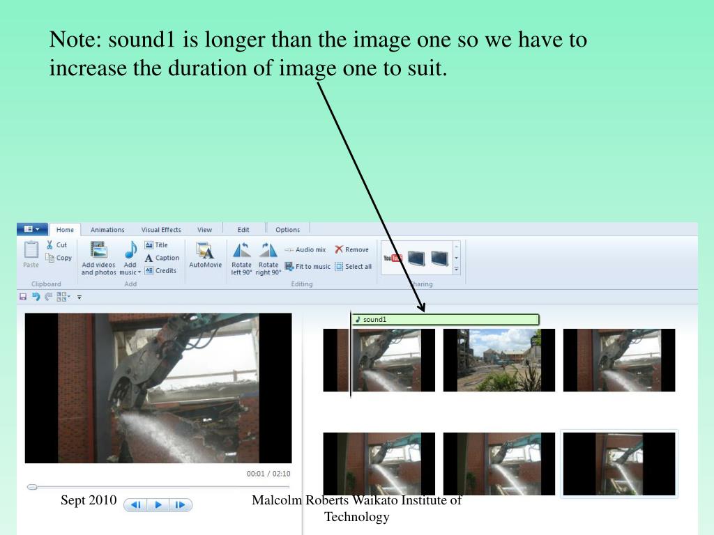 Note: sound1 is longer than the image one so we have to increase the duration of image one to suit. Malcolm Roberts Waikato Institute of Technology