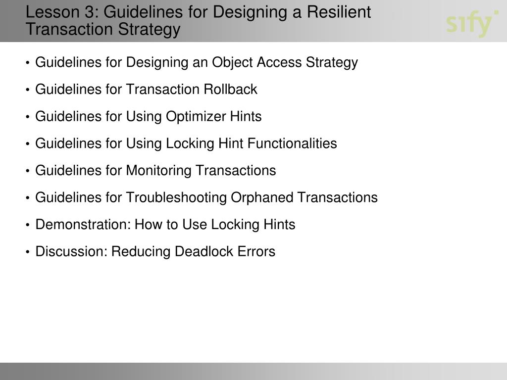 Guidelines for Designing an Object Access Strategy Guidelines for Transaction Rollback Guidelines for Using Optimizer Hints Guidelines for Using Locking Hint Functionalities Guidelines for Monitoring Transactions Guidelines for Troubleshooting Orphaned Transactions Demonstration: How to Use Locking Hints Discussion: Reducing Deadlock Errors Lesson 3: Guidelines for Designing a Resilient Transaction Strategy