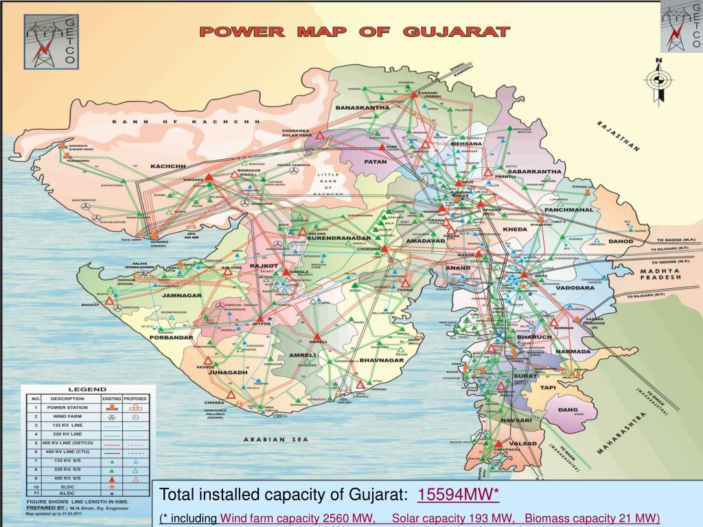 Total installed capacity of Gujarat: 15594MW* (* including Wind farm capacity 2560 MW, Solar capacity 193 MW, Biomass capacity 21 MW)