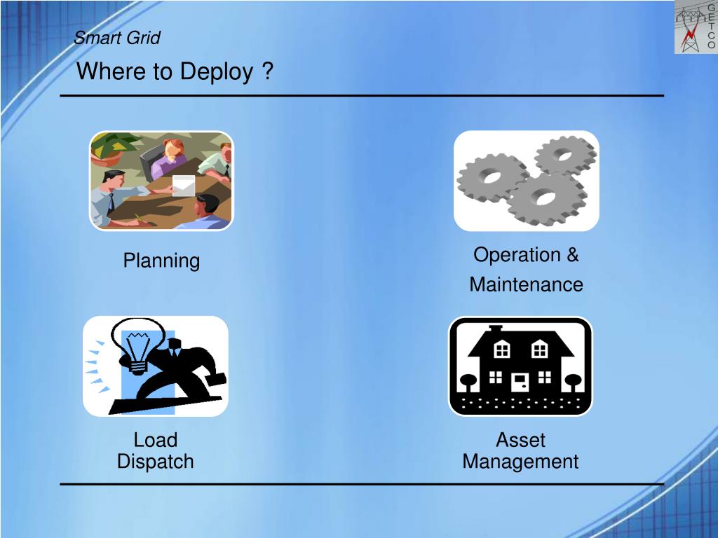 Smart GridWhere to Deploy ? • Planning • Operation & • Maintenance • Load Dispatch • Asset Management