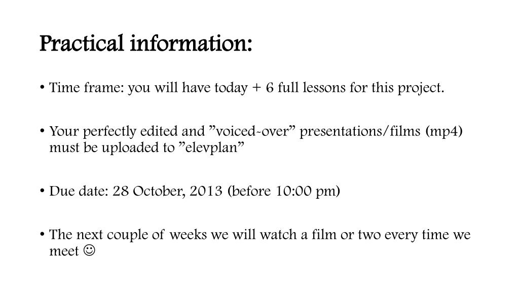 Practical information: • Time frame: you will have today + 6 full lessons for this project. • Your perfectly edited and ”voiced-over” presentations/films (mp4) must be uploaded to ”elevplan” • Due date: 28 October, 2013 (before 10:00 pm) • The next couple of weeks we will watch a film or two every time we meet