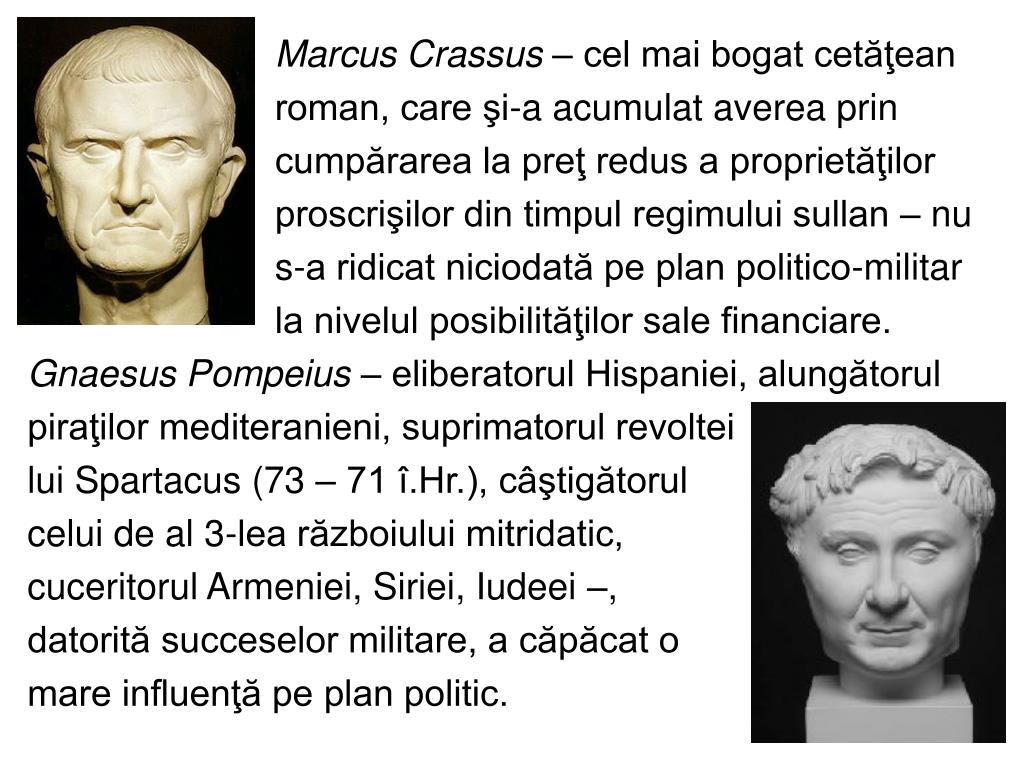 Marcus Crassus – cel mai bogat cetăţean roman, care şi-a acumulat averea prin cumpărarea la preţ redus a proprietăţilor proscrişilor din timpul regimului sullan – nu s-a ridicat niciodată pe plan politico-militar la nivelul posibilităţilor sale financiare. Gnaesus Pompeius – eliberatorul Hispaniei, alungătorul piraţilor mediteranieni, suprimatorul revoltei lui Spartacus (73 – 71 î.Hr.), câştigătorul celui de al 3-lea războiului mitridatic, cuceritorul Armeniei, Siriei, Iudeei –, datorită succeselor militare, a căpăcat o mare influenţă pe plan politic.