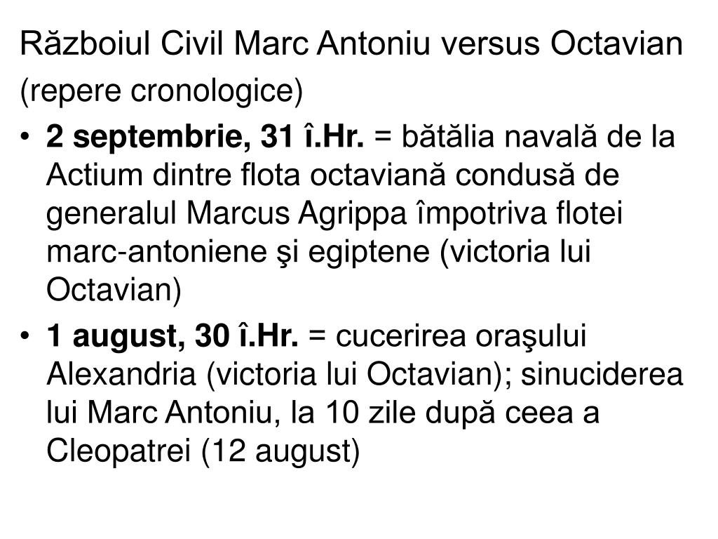 Războiul Civil Marc Antoniu versus Octavian (repere cronologice) • 2 septembrie, 31 î.Hr. = bătălia navală de la Actium dintre flota octaviană condusă de generalul Marcus Agrippa împotriva flotei marc-antoniene şi egiptene (victoria lui Octavian) • 1 august, 30 î.Hr. = cucerirea oraşului Alexandria (victoria lui Octavian); sinuciderea lui Marc Antoniu, la 10 zile după ceea a Cleopatrei (12 august)