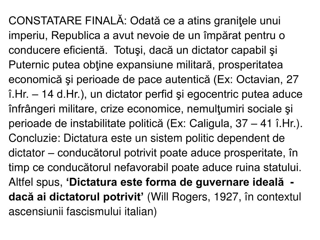 CONSTATARE FINALĂ: Odată ce a atins graniţele unui imperiu, Republica a avut nevoie de un împărat pentru o conducere eficientă. Totuşi, dacă un dictator capabil şi Puternic putea obţine expansiune militară, prosperitatea economică şi perioade de pace autentică (Ex: Octavian, 27 î.Hr. – 14 d.Hr.), un dictator perfid şi egocentric putea aduce înfrângeri militare, crize economice, nemulţumiri sociale şi perioade de instabilitate politică (Ex: Caligula, 37 – 41 î.Hr.). Concluzie: Dictatura este un sistem politic dependent de dictator – conducătorul potrivit poate aduce prosperitate, în timp ce conducătorul nefavorabil poate aduce ruina statului. Altfel spus, ‘Dictatura este forma de guvernare ideală - dacă ai dictatorul potrivit’ (Will Rogers, 1927, în contextul ascensiunii fascismului italian)