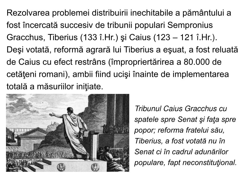 Rezolvarea problemei distribuirii inechitabile a pământului a fost încercată succesiv de tribunii populari Sempronius Gracchus, Tiberius (133 î.Hr.) şi Caius (123 – 121 î.Hr.). Deşi votată, reformă agrară lui Tiberius a eşuat, a fost reluată de Caius cu efect restrâns (împropriertărirea a 80.000 de cetăţeni romani), ambii fiind ucişi înainte de implementarea totală a măsuriilor iniţiate. Tribunul Caius Gracchus cu spatele spre Senat şi faţa spre popor; reforma fratelui său, Tiberius, a fost votată nu în Senat ci în cadrul adunărilor populare, fapt neconstituţional.