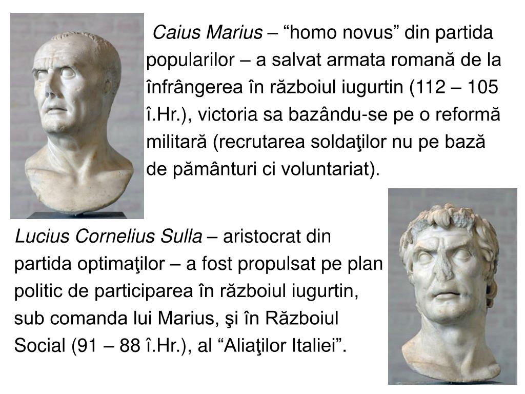 Caius Marius – “homo novus” din partida popularilor – a salvat armata romană de la înfrângerea în războiul iugurtin (112 – 105 î.Hr.), victoria sa bazându-se pe o reformă militară (recrutarea soldaţilor nu pe bază de pământuri ci voluntariat). Lucius Cornelius Sulla – aristocrat din partida optimaţilor – a fost propulsat pe plan politic de participarea în războiul iugurtin, sub comanda lui Marius, şi în Războiul Social (91 – 88 î.Hr.), al “Aliaţilor Italiei”.
