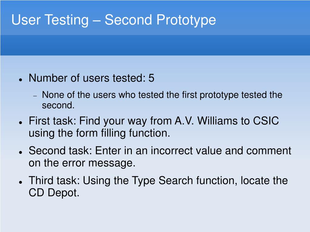 User Testing – Second Prototype • Number of users tested: 5 • None of the users who tested the first prototype tested the second. • First task: Find your way from A.V. Williams to CSIC using the form filling function. • Second task: Enter in an incorrect value and comment on the error message. • Third task: Using the Type Search function, locate the CD Depot.
