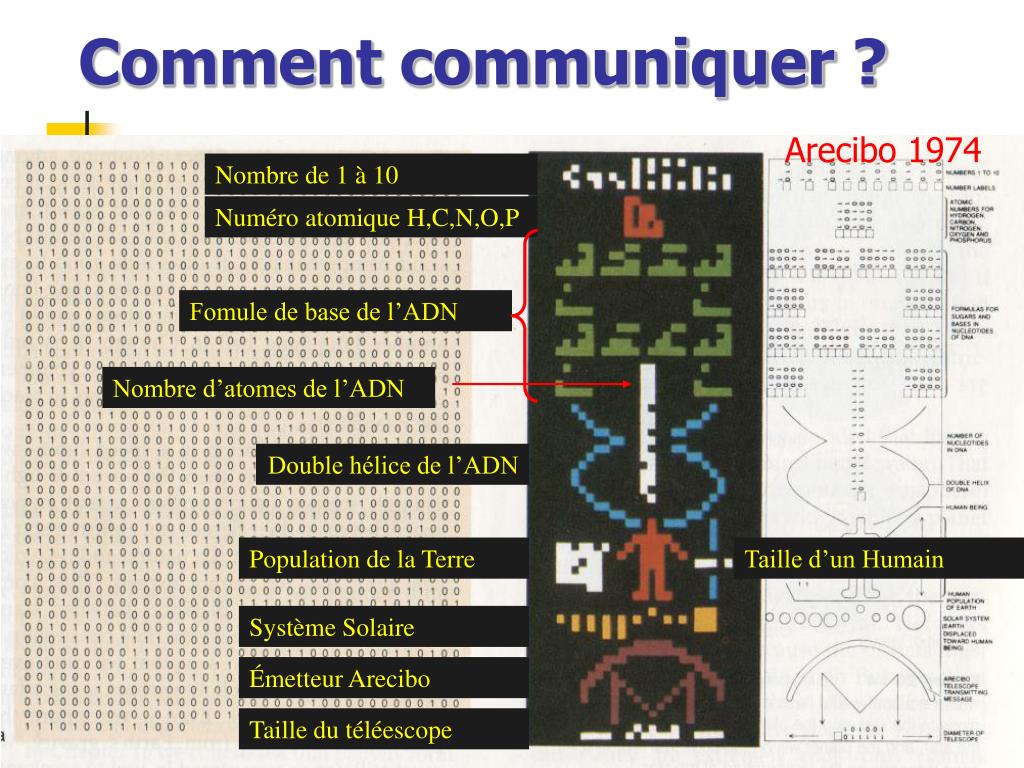 Fomule de base de l’ADN Nombre d’atomes de l’ADN Comment communiquer ? Arecibo 1974 Nombre de 1 à 10 Numéro atomique H,C,N,O,P Double hélice de l’ADN Population de la Terre Taille d’un Humain Système Solaire Émetteur Arecibo Taille du téléescope