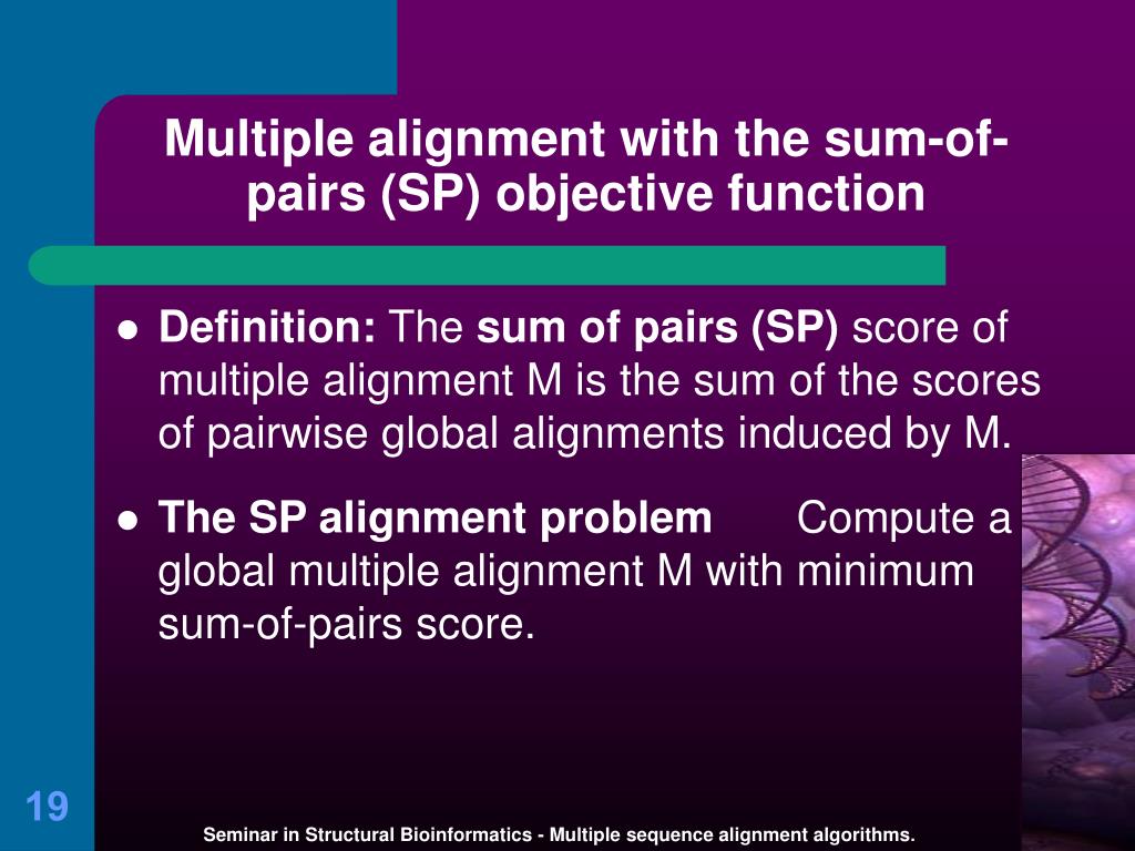 Multiple alignment with the sum-of-pairs (SP) objective function • Definition: The sum of pairs (SP) score of multiple alignment M is the sum of the scores of pairwise global alignments induced by M. • The SP alignment problem Compute a global multiple alignment M with minimum sum-of-pairs score. Seminar in Structural Bioinformatics - Multiple sequence alignment algorithms.
