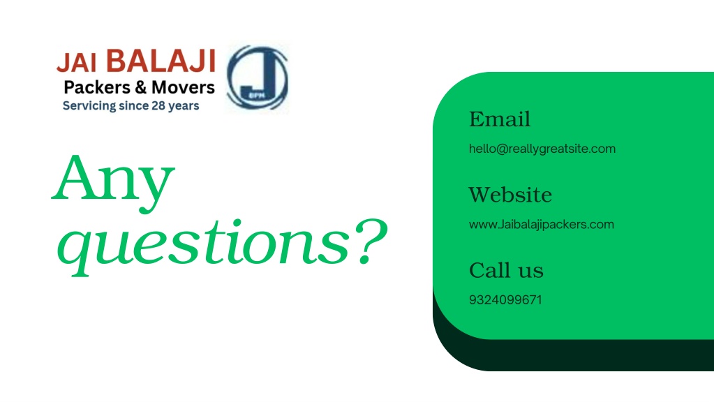 Email Any questions? hello@reallygreatsite.com Website www.Jaibalajipackers.com Call us 9324099671