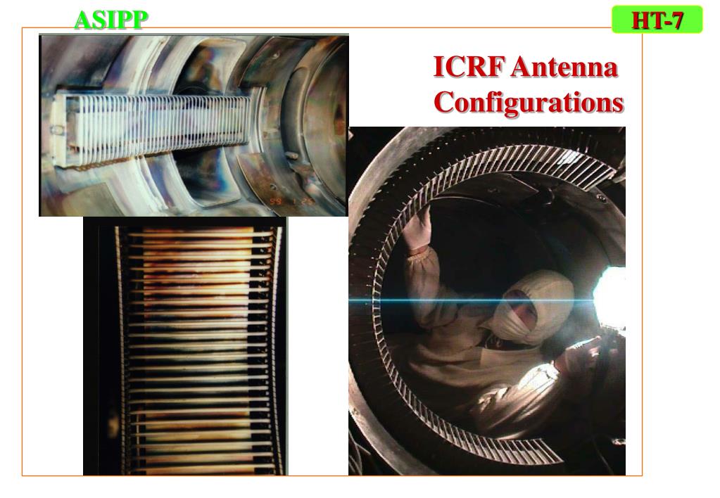 ASIPP HT-7 ICRF Boronization (1) ICRF also forCleaning, Boronization Siliconization, Isotope control, etc • Leads to: • Reduced impurity influxes and radiation power • Improved energy/particle confinement times • Extended operation limit Comparing for the QMS before and after RF boronization The residential gas analysis during ICRF boronization. BT = 1.8T, PRF = 10 KW, f = 30 MHz