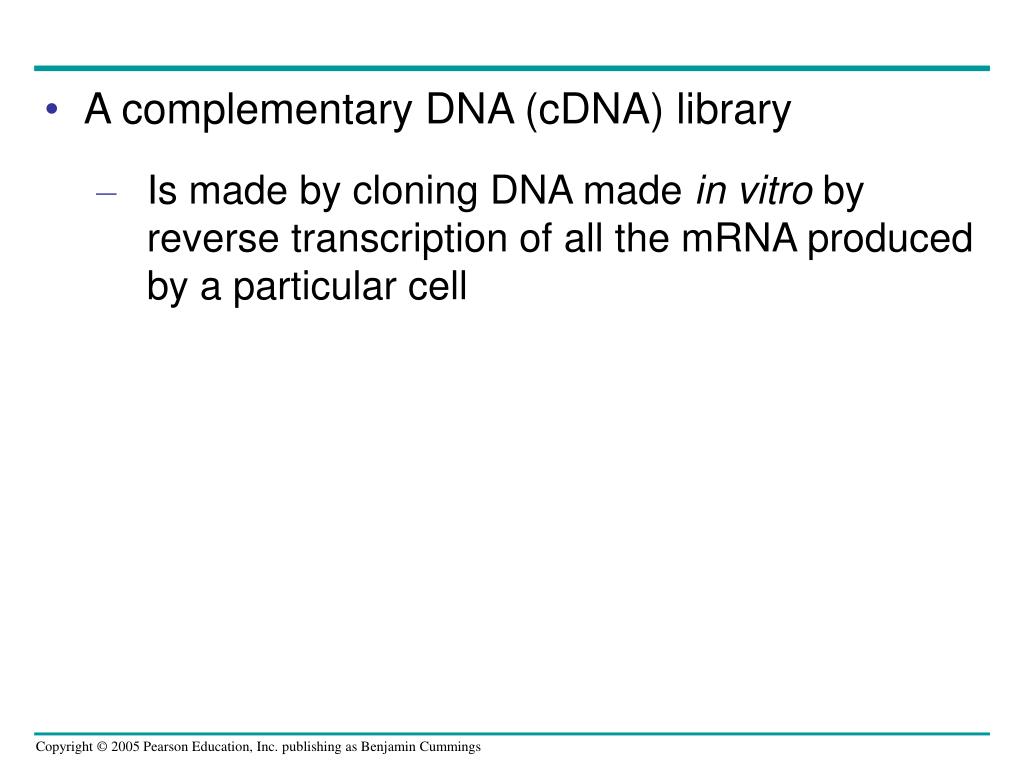 A complementary DNA (cDNA) library • Is made by cloning DNA made in vitro by reverse transcription of all the mRNA produced by a particular cell