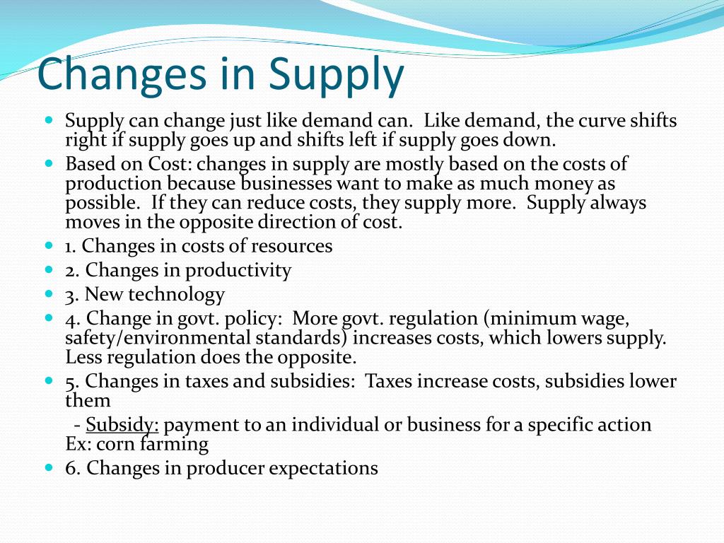Changes in Supply • Supply can change just like demand can. Like demand, the curve shifts right if supply goes up and shifts left if supply goes down. • Based on Cost: changes in supply are mostly based on the costs of production because businesses want to make as much money as possible. If they can reduce costs, they supply more. Supply always moves in the opposite direction of cost. • 1. Changes in costs of resources • 2. Changes in productivity • 3. New technology • 4. Change in govt. policy: More govt. regulation (minimum wage, safety/environmental standards) increases costs, which lowers supply. Less regulation does the opposite. • 5. Changes in taxes and subsidies: Taxes increase costs, subsidies lower them - Subsidy: payment to an individual or business for a specific action Ex: corn farming • 6. Changes in producer expectations