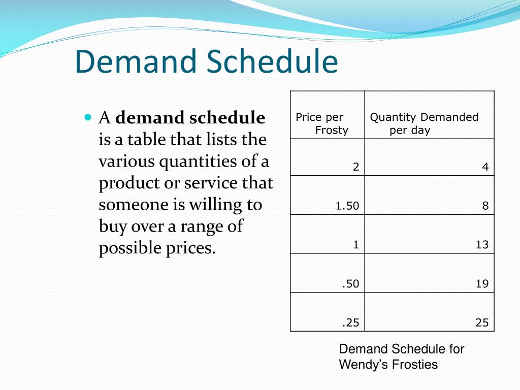 Demand Schedule • A demand schedule is a table that lists the various quantities of a product or service that someone is willing to buy over a range of possible prices. Demand Schedule for Wendy’s Frosties