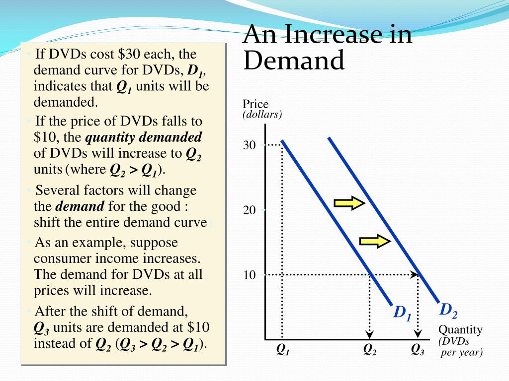 D2 An Increase in Demand • If DVDs cost $30 each, the demand curve for DVDs, D1, indicates that Q1 units will be demanded. Price(dollars) • If the price of DVDs falls to $10, the quantity demanded of DVDs will increase to Q2units(where Q2>Q1). 30 • Several factors will change the demandfor the good : shift the entire demand curve). 20 • As an example, suppose consumer income increases. The demand for DVDs at all prices will increase. 10 D1 • After the shift of demand, Q3 units are demanded at $10 instead of Q2 (Q3>Q2>Q1). Quantity(DVDs per year) Q1 Q2 Q3