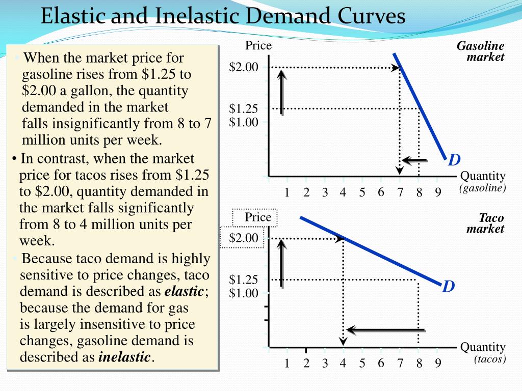 Elastic and Inelastic Demand Curves Price Gasolinemarket • When the market price for gasoline rises from $1.25 to $2.00 a gallon, the quantity demanded in the market • falls insignificantly from 8 to 7 million units per week. $2.00 $1.25 $1.00 D • In contrast, when the market price for tacos rises from $1.25 to $2.00, quantity demanded in the market falls significantly from 8 to 4 million units per week. Quantity(gasoline) 6 2 4 5 7 9 1 3 8 Price Tacomarket $2.00 • Because taco demand is highly sensitive to price changes, taco demand is described as elastic; because the demand for gas is largely insensitive to price changes, gasoline demand is described as inelastic. $1.25 D $1.00 Quantity(tacos) 6 2 4 5 7 9 1 3 8