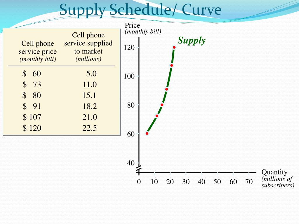 Supply Supply Schedule/ Curve Price(monthly bill) Cell phone service supplied to market(millions) Cell phone service price(monthly bill) 120 $ 60 5.0 100 $ 73 11.0 $ 80 15.1 80 $ 91 18.2 $ 107 21.0 $ 120 22.5 60 40 Quantity(millions of subscribers) 0 10 20 30 40 50 60 70