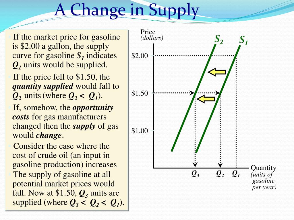 S2 S1 A Change in Supply Price(dollars) • If the market price for gasoline is $2.00 a gallon, the supply curve for gasoline S1 indicates Q1 units would be supplied. $2.00 • If the price fell to $1.50, the quantity supplied would fall to Q2units(where Q2<Q1). $1.50 • If, somehow, the opportunity costs for gas manufacturers changed then the supply of gas would change. $1.00 • Consider the case where the cost of crude oil (an input in gasoline production) increases. Quantity(units of gasoline per year) Q3 Q2 Q1 • The supply of gasoline at all potential market prices would fall. Now at $1.50, Q3 units are supplied (where Q3<Q2<Q1).