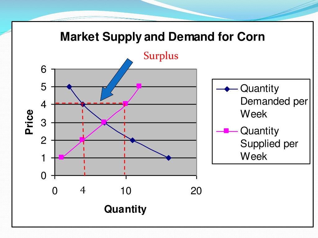 Market Equilibrium • A surplus is the amount by which the quantity supplied is higher than the quantity demanded. 1. A surplus signals that the price is too high. 2. At that price, consumers will not buy all of the product that suppliers are willing to supply. 3. In a competitive market, a surplus will not last. Sellers will lower their price to sell their goods.