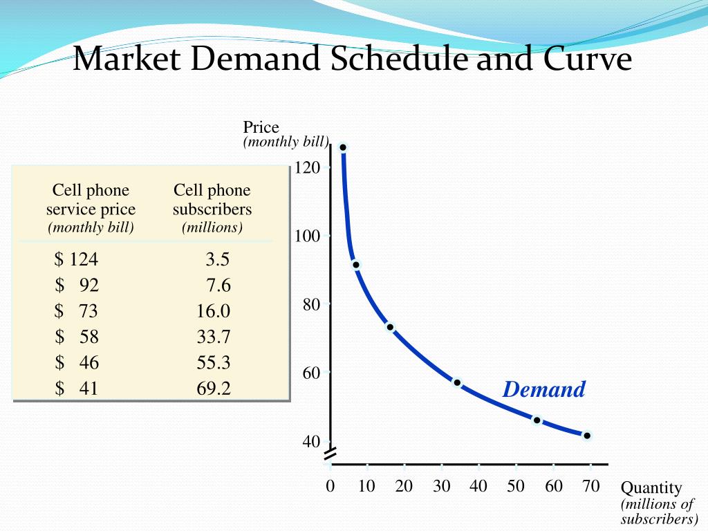 Demand Market Demand Schedule and Curve Price(monthly bill) 120 Cell phone service price(monthly bill) Cell phone subscribers(millions) 100 $ 124 3.5 $ 92 7.6 80 $ 73 16.0 $ 58 33.7 $ 46 55.3 60 $ 41 69.2 40 0 10 20 30 40 50 60 70 Quantity(millions of subscribers)
