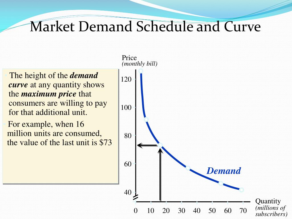 Market Demand Schedule and Curve Price(monthly bill) • The height of the demand curve at any quantity shows the maximum price that consumers are willing to pay for that additional unit. 120 100 • For example, when 16 million units are consumed, the value of the last unit is $73. 80 60 Demand 40 Quantity(millions of subscribers) 0 10 20 30 40 50 60 70