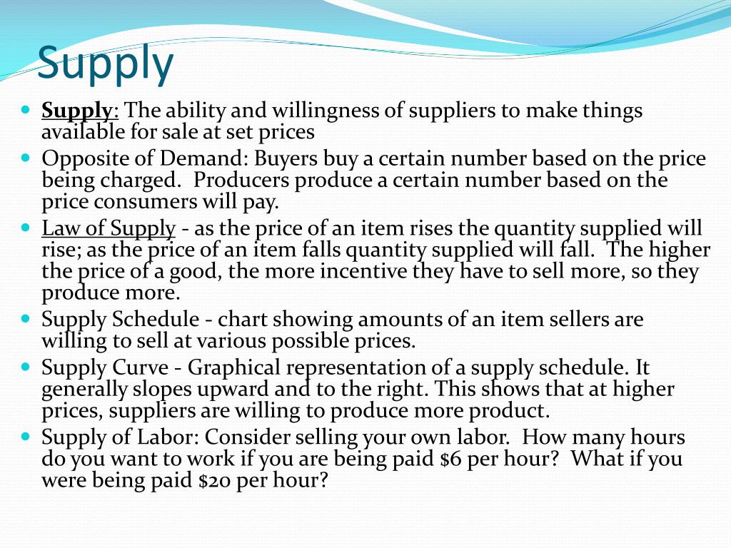 Supply • Supply: The ability and willingness of suppliers to make things available for sale at set prices • Opposite of Demand: Buyers buy a certain number based on the price being charged. Producers produce a certain number based on the price consumers will pay. • Law of Supply - as the price of an item rises the quantity supplied will rise; as the price of an item falls quantity supplied will fall. The higher the price of a good, the more incentive they have to sell more, so they produce more. • Supply Schedule - chart showing amounts of an item sellers are willing to sell at various possible prices. • Supply Curve - Graphical representation of a supply schedule. It generally slopes upward and to the right. This shows that at higher prices, suppliers are willing to produce more product. • Supply of Labor: Consider selling your own labor. How many hours do you want to work if you are being paid $6 per hour? What if you were being paid $20 per hour?