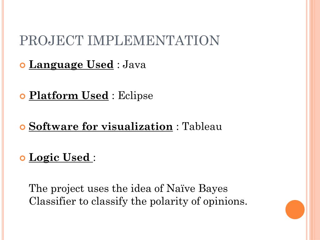 PROJECT IMPLEMENTATION • Language Used: Java • Platform Used : Eclipse • Software for visualization: Tableau • Logic Used : The project uses the idea ofNaïve Bayes Classifier to classify the polarity of opinions.