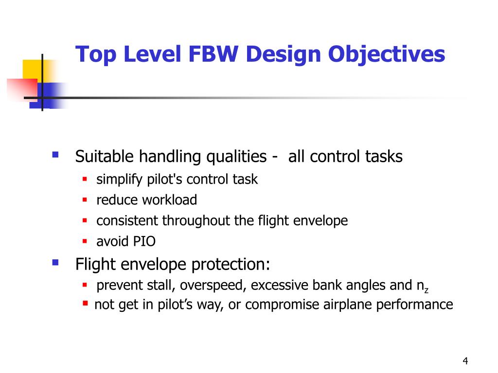 Top Level FBW Design Objectives • Suitable handling qualities - all control tasks • simplify pilot's control task • reduce workload • consistent throughout the flight envelope • avoid PIO • Flight envelope protection: • prevent stall, overspeed, excessive bank angles and nz • not get in pilot’s way, or compromise airplane performance