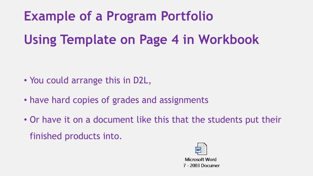 Example of a Program PortfolioUsing Template on Page 4 in Workbook • You could arrange this in D2L, • have hard copies of grades and assignments • Or have it on a document like this that the students put their finished products into.