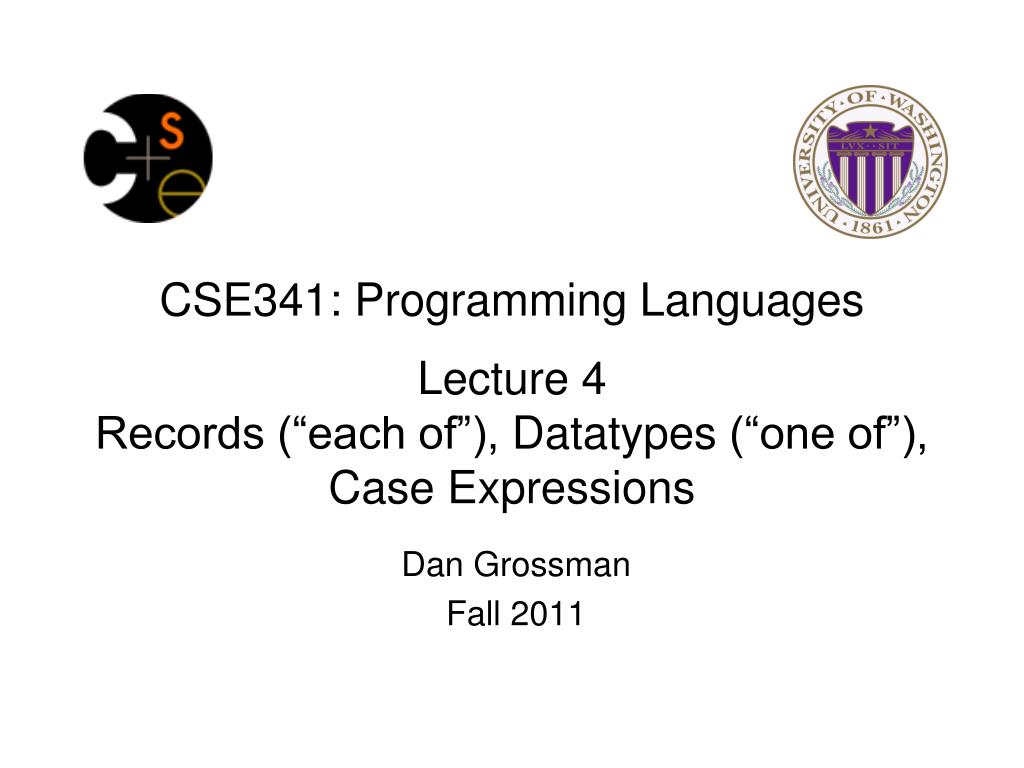 CSE341: Programming Languages Lecture 4 Records (“each of”), Datatypes (“one of”), Case Expressions. Dan Grossman Fall 2011. Review. Done: functions, tuples, lists, local bindings, options Done: syntax vs. semantics, environments, mutation-free Today: Focus on compound types