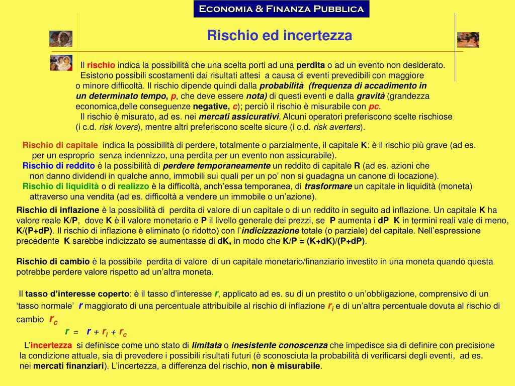 Economia & Finanza Pubblica. Rischio ed incertezza. Il rischio indica la possibilità che una scelta porti ad una perdita o ad un evento non desiderato. Esistono possibili scostamenti dai risultati attesi a causa di eventi prevedibili con maggiore