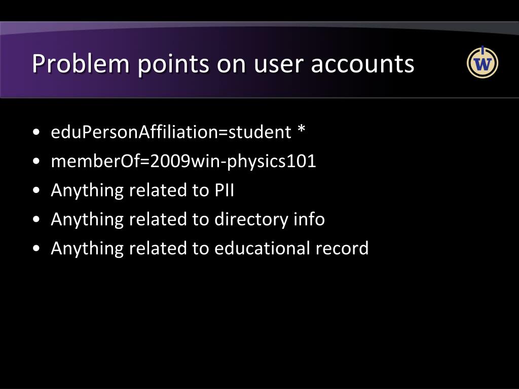 Problem points on user accounts • eduPersonAffiliation=student * • memberOf=2009win-physics101 • Anything related to PII • Anything related to directory info • Anything related to educational record