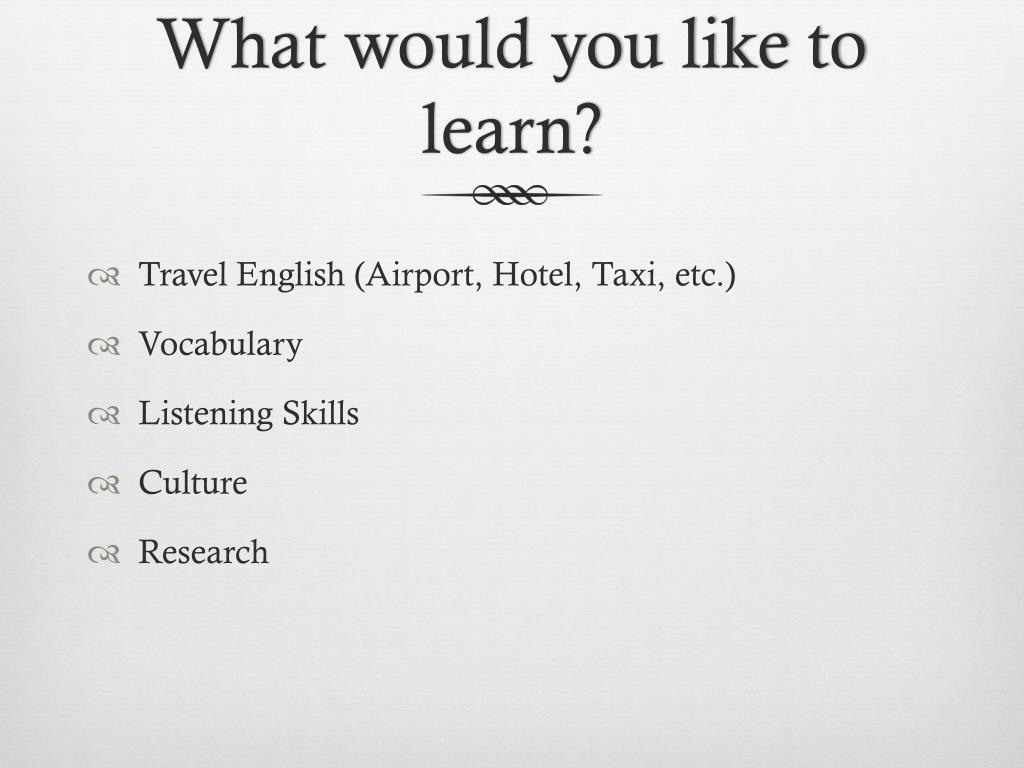 What would you like to learn? Travel English (Airport, Hotel, Taxi, etc.) Vocabulary Listening Skills Culture Research