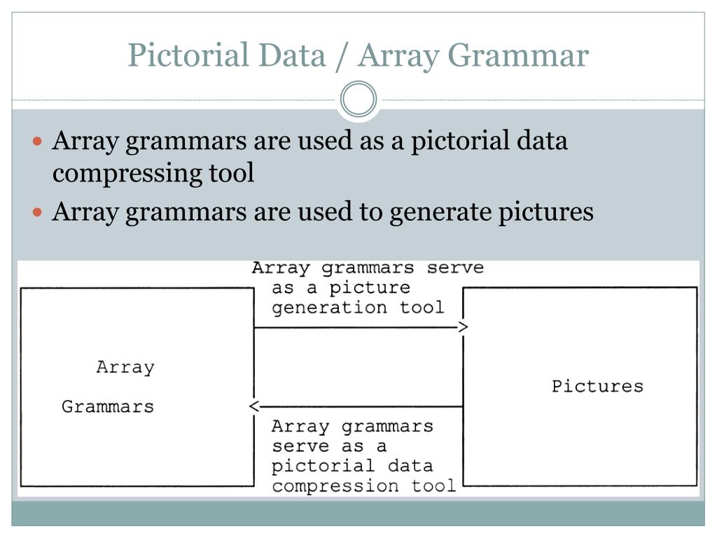 Pictorial Data / Array Grammar The main idea in compressing pictures in array grammar is to find the suitable array grammar, which will be able to generate the initial picture when it is desired.