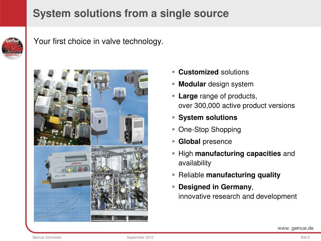 Customized solutions Modular design system Large range of products, over 300,000 active product versions System solutions One-Stop Shopping Global presence High manufacturing capacities and availability Reliable manufacturing quality Designed in Germany,innovative research and development System solutions from a single source Your first choice in valve technology.