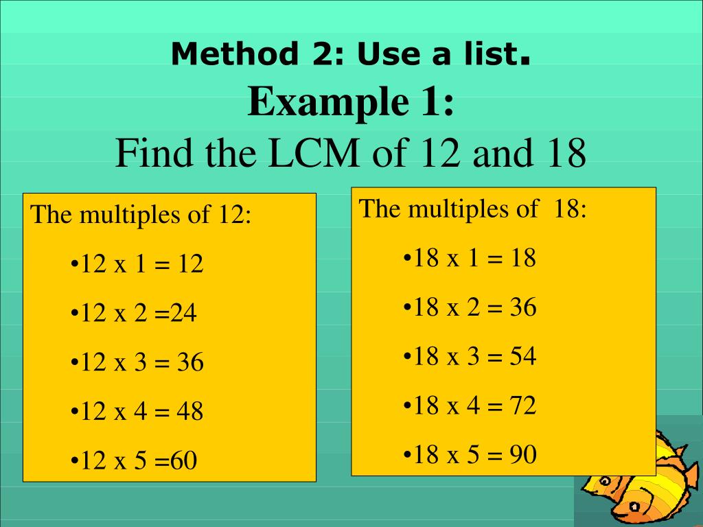 Method 2: Use a list.Example 1: Find the LCM of 12 and 18 • The multiples of 18: • 18 x 1 = 18 • 18 x 2 = 36 • 18 x 3 = 54 • 18 x 4 = 72 • 18 x 5 = 90 • The multiples of 12: • 12 x 1 = 12 • 12 x 2 =24 • 12 x 3 = 36 • 12 x 4 = 48 • 12 x 5 =60