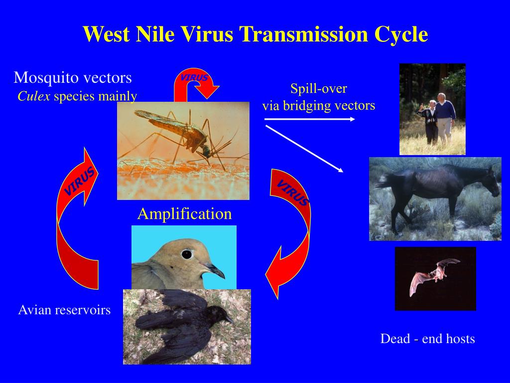 West Nile Virus Transmission Cycle Mosquito vectors Culex species mainly VIRUS Spill-over via bridging vectors VIRUS VIRUS Amplification Avianreservoirs Dead - endhosts