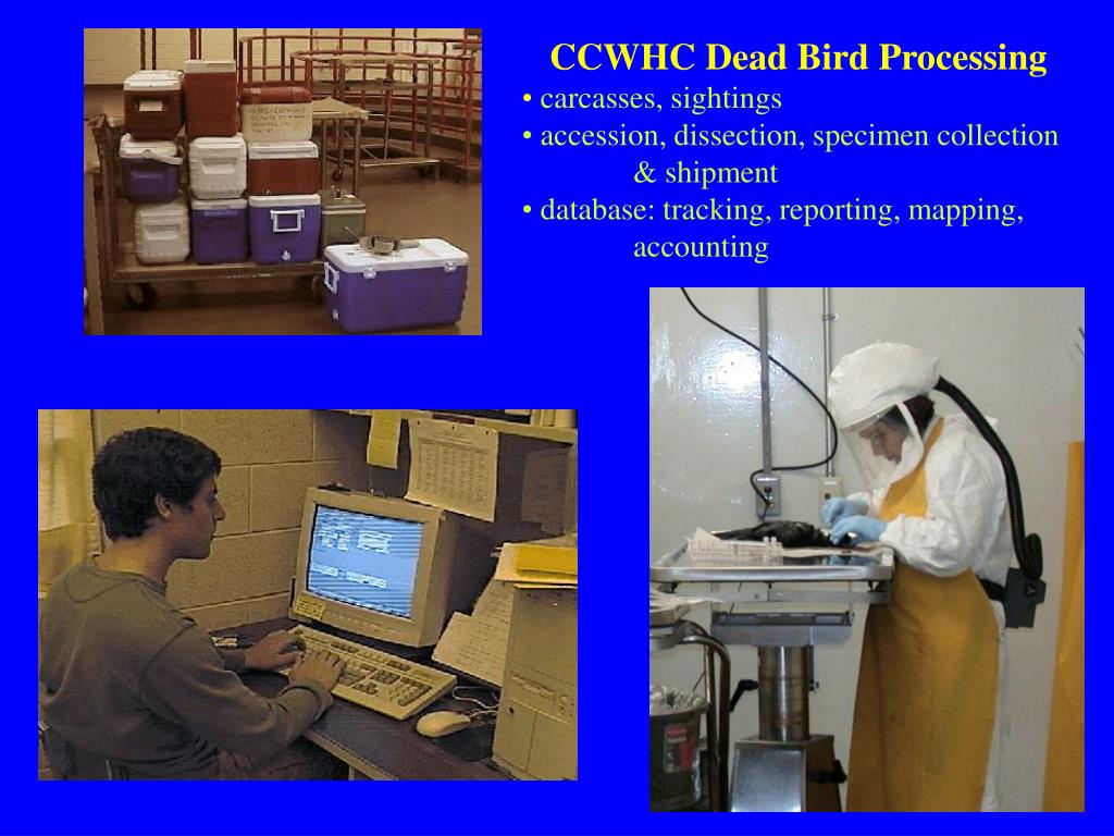 CCWHC Dead Bird Processing • carcasses, sightings • accession, dissection, specimen collection & shipment • database: tracking, reporting, mapping, accounting
