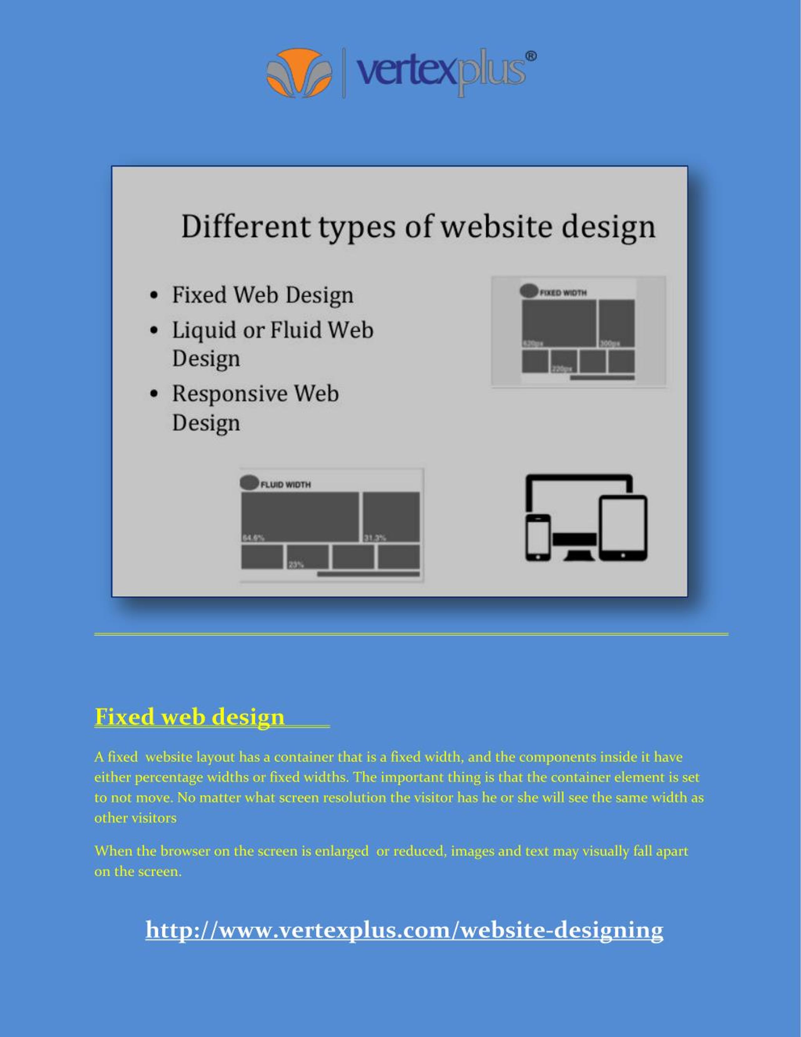 Fixed web design A fixed website layout has a container that is a fixed width, and the components inside it have either percentage widths or fixed widths. The important thing is that the container element is set to not move. No matter what screen resolution the visitor has he or she will see the same width as other visitors When the browser on the screen is enlarged or reduced, images and text may visually fall apart on the screen. http://www.vertexplus.com/website-designing