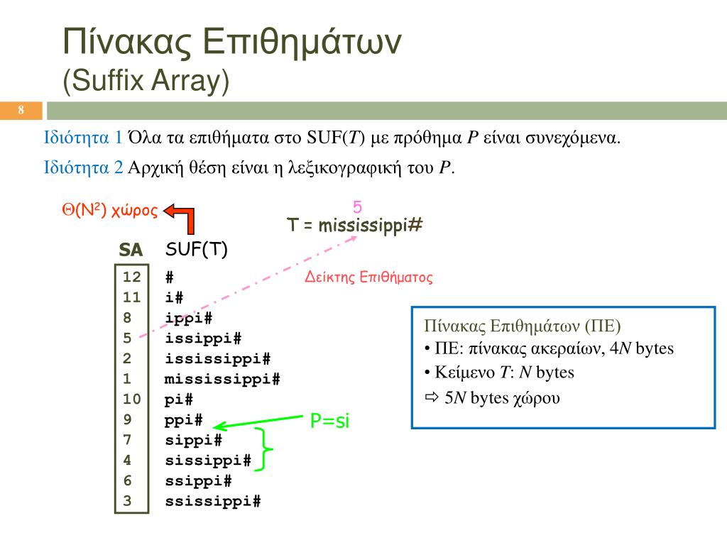 SA 12 11 8 5 2 1 10 9 7 4 6 3 P είναι μικρότερο si Ψάξιμο σε Πίνακα Επιθημάτων Δυαδικό ψάξιμο στο ΠΕ: O(plog2N) χρόνος T = mississippi#