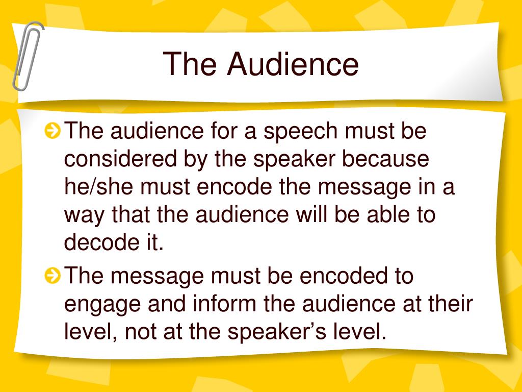 The Audience • The audience for a speech must be considered by the speaker because he/she must encode the message in a way that the audience will be able to decode it. • The message must be encoded to engage and inform the audience at their level, not at the speaker’s level.