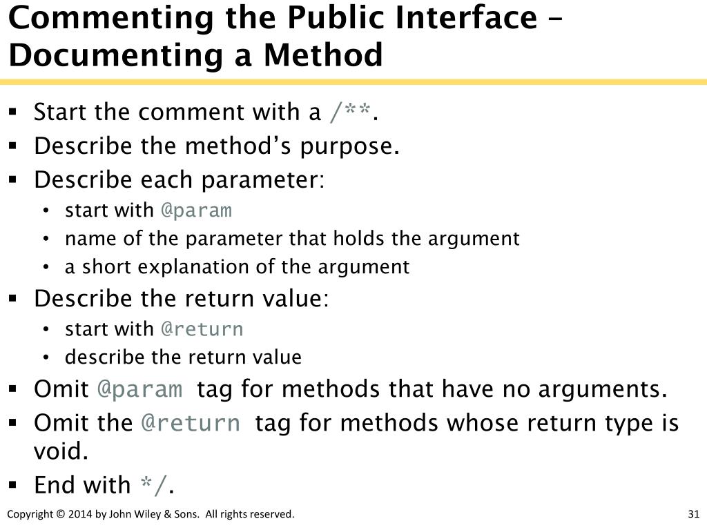 Start the comment with a /**. Describe the method’s purpose. Describe each parameter: start with @param name of the parameter that holds the argument a short explanation of the argument Describe the return value: start with @return describe the return value Omit @paramtag for methods that have no arguments. Omit the @return tag for methods whose return type is void. End with */. Commenting the Public Interface – Documenting a Method
