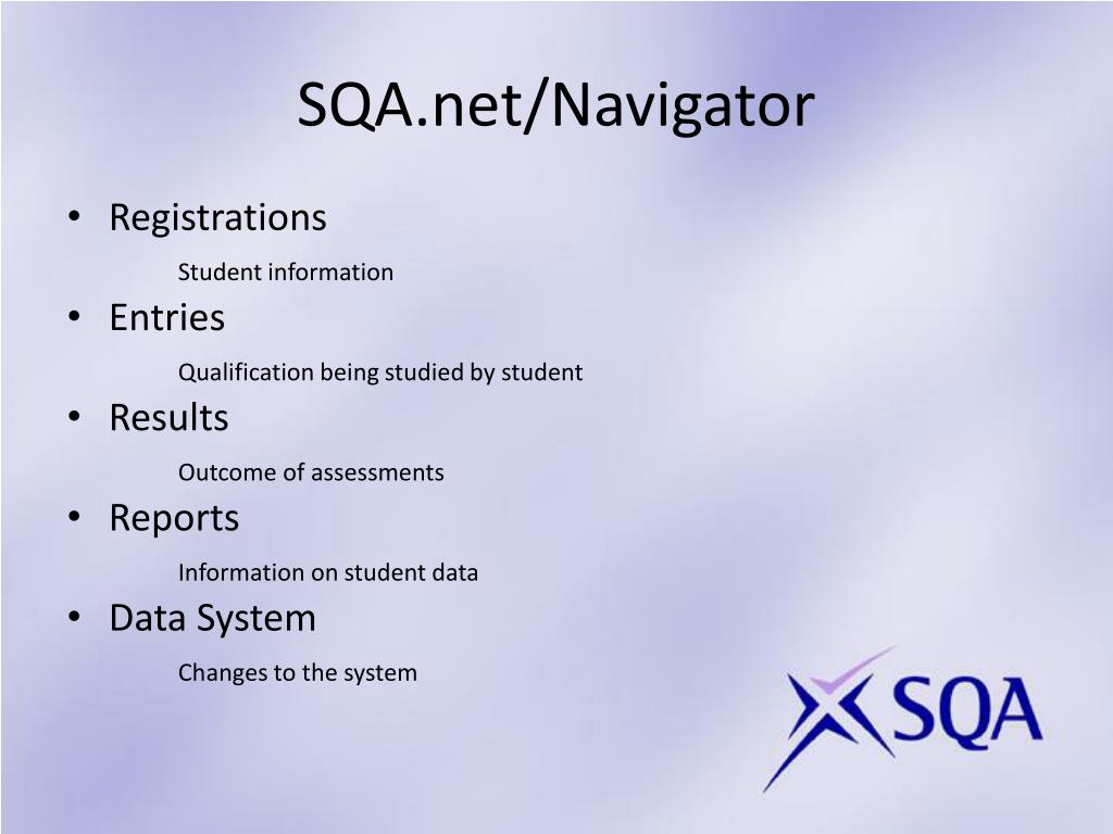 SQA.net/Navigator • Registrations Student information • Entries Qualification being studied by student • Results Outcome of assessments • Reports Information on student data • Data System Changes to the system