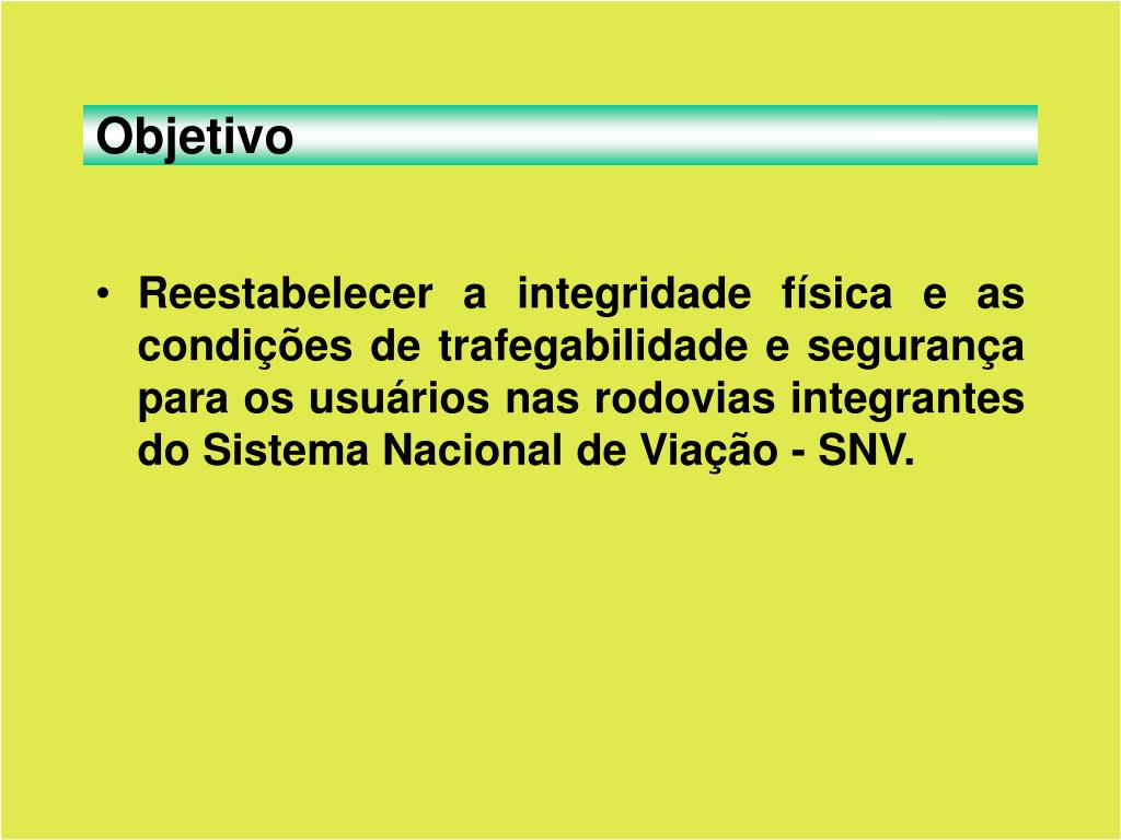 Objetivo • Reestabelecer a integridade física e as condições de trafegabilidade e segurança para os usuários nas rodovias integrantes do Sistema Nacional de Viação - SNV.