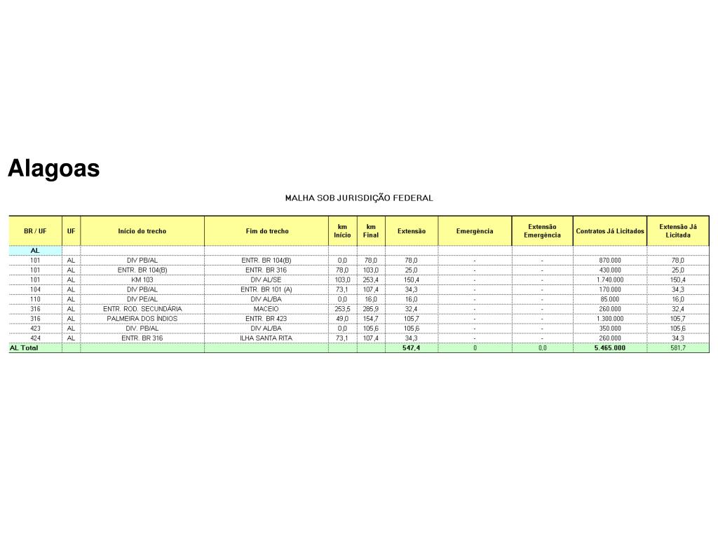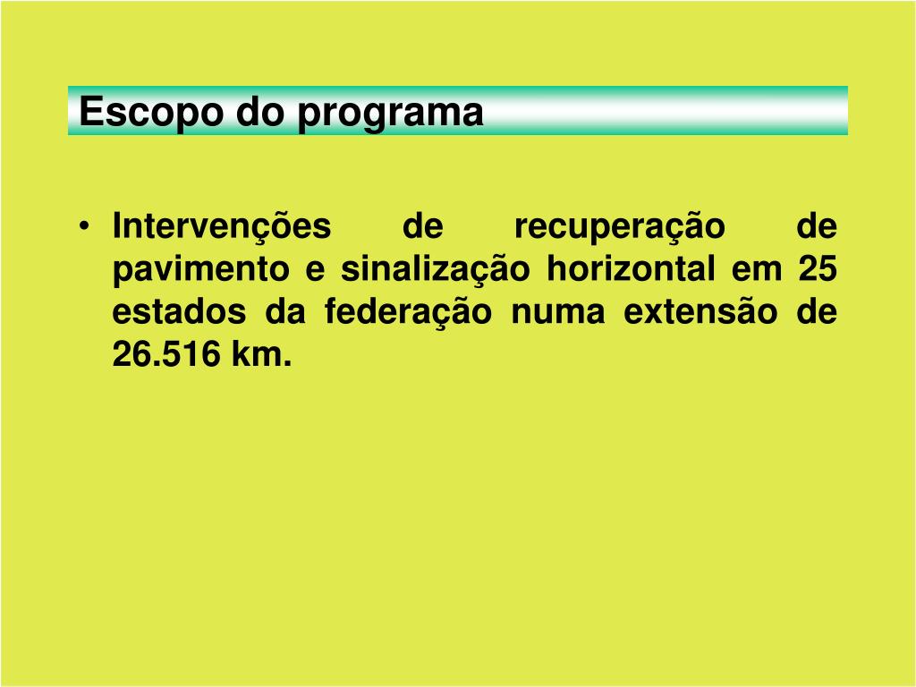 Escopo do programa • Intervenções de recuperação de pavimento e sinalização horizontal em 25 estados da federação numa extensão de 26.516 km.
