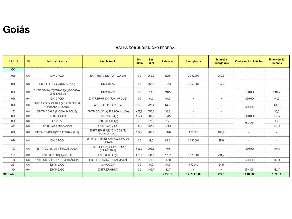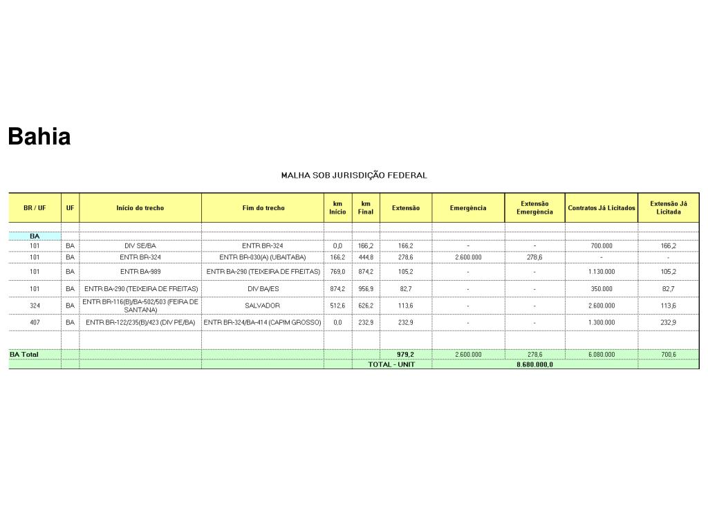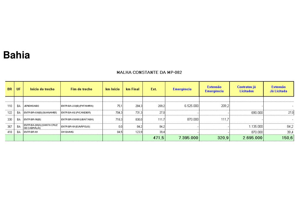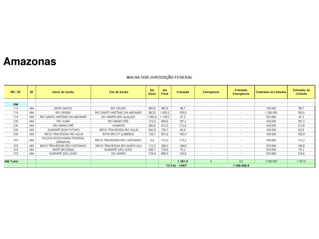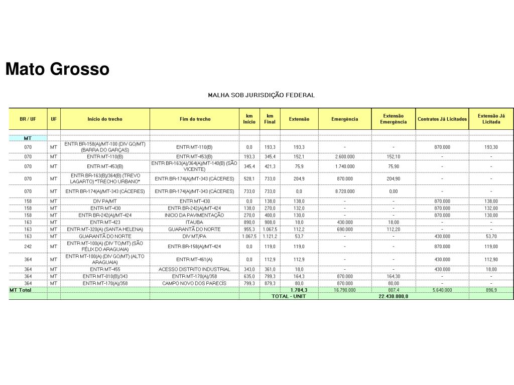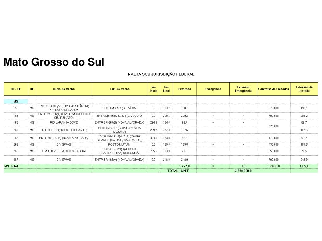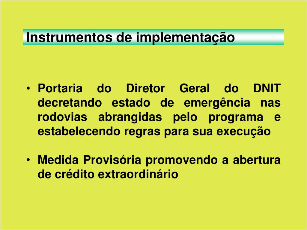 Instrumentos de implementação • Portaria do Diretor Geral do DNIT decretando estado de emergência nas rodovias abrangidas pelo programa e estabelecendo regras para sua execução • Medida Provisória promovendo a abertura de crédito extraordinário