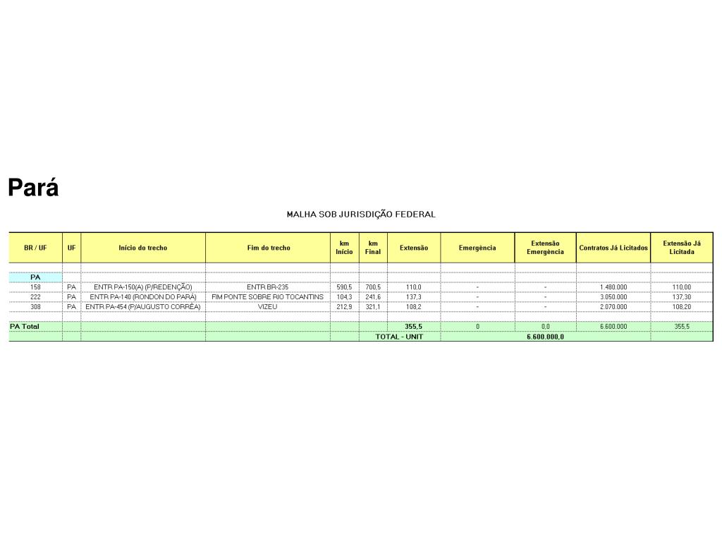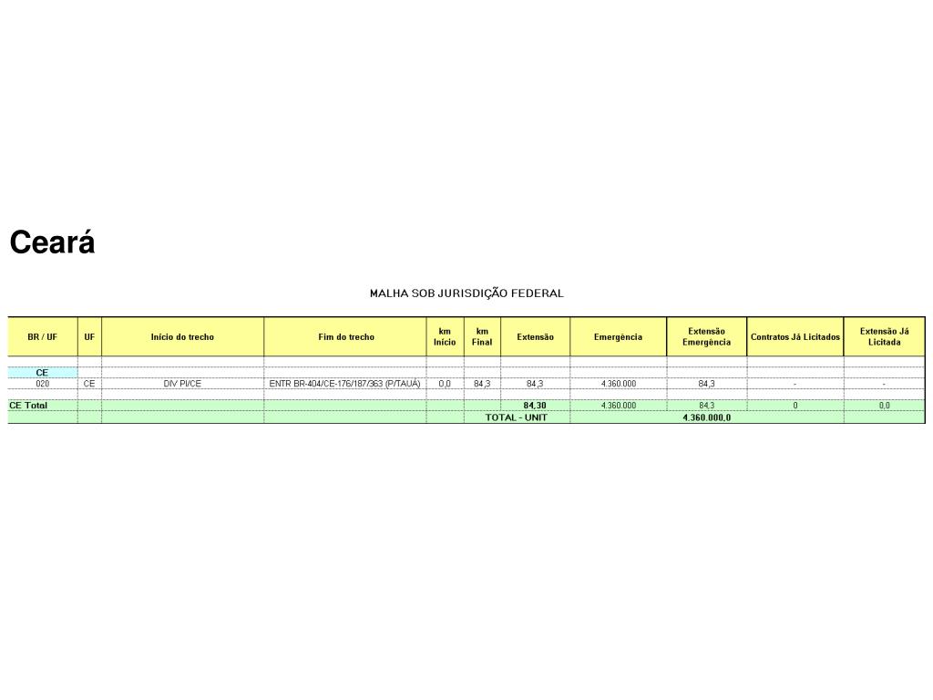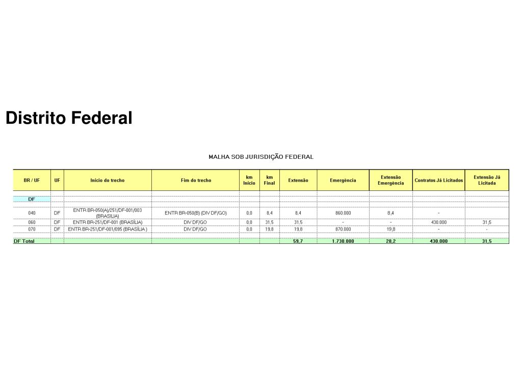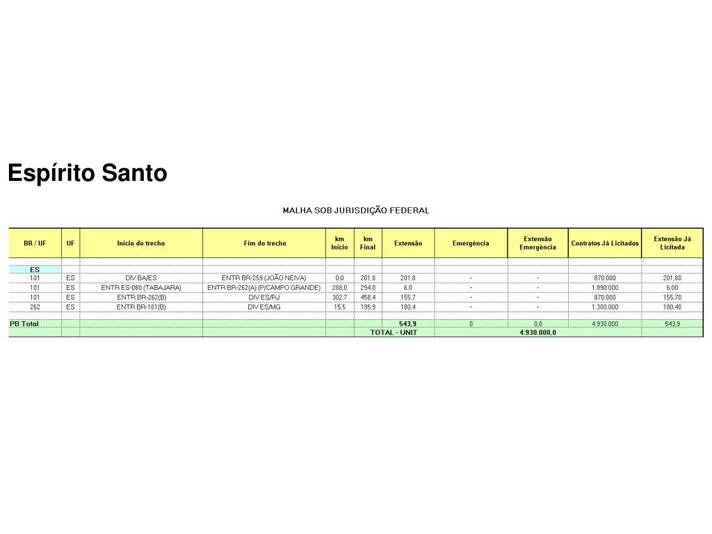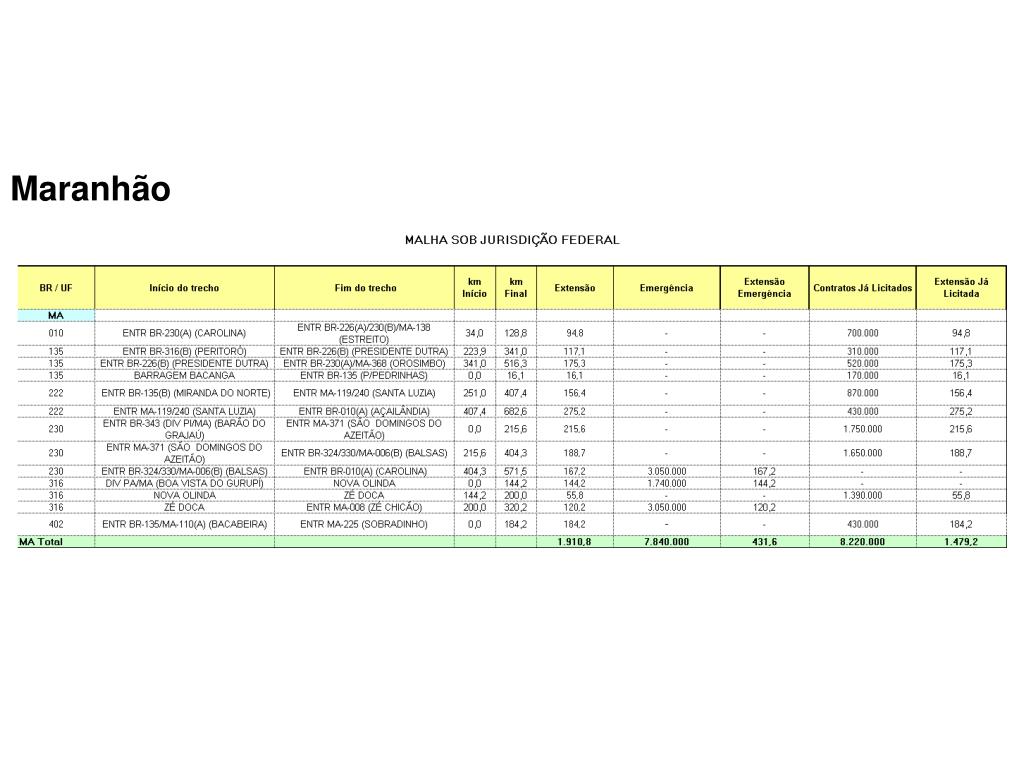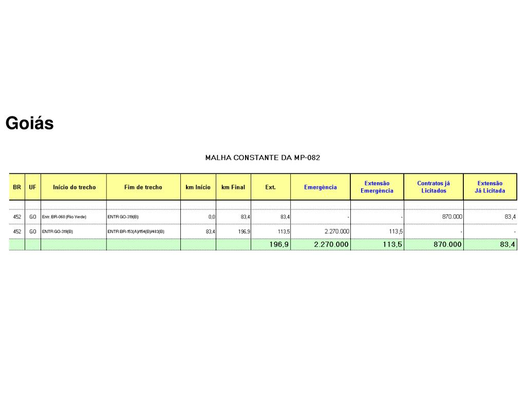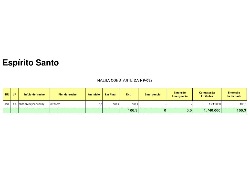 Instrumentos de implementação • Portaria do Diretor Geral do DNIT decretando estado de emergência nas rodovias abrangidas pelo programa e estabelecendo regras para sua execução • Medida Provisória promovendo a abertura de crédito extraordinário