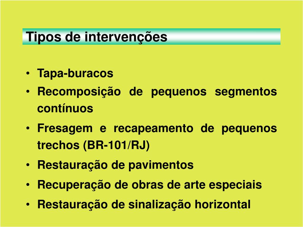 Tipos de intervenções • Tapa-buracos • Recomposição de pequenos segmentos contínuos • Fresagem e recapeamento de pequenos trechos (BR-101/RJ) • Restauração de pavimentos • Recuperação de obras de arte especiais • Restauração de sinalização horizontal