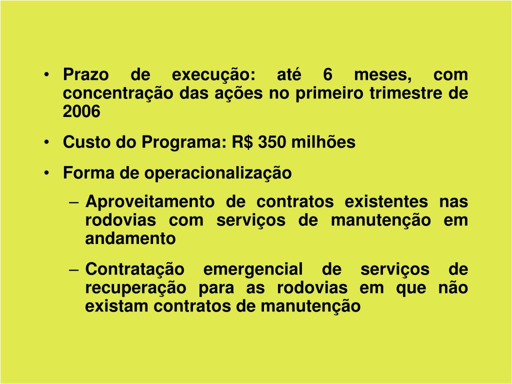 Prazo de execução: até 6 meses, com concentração das ações no primeiro trimestre de 2006 • Custo do Programa: R$ 350 milhões • Forma de operacionalização • Aproveitamento de contratos existentes nas rodovias com serviços de manutenção em andamento • Contratação emergencial de serviços de recuperação para as rodovias em que não existam contratos de manutenção